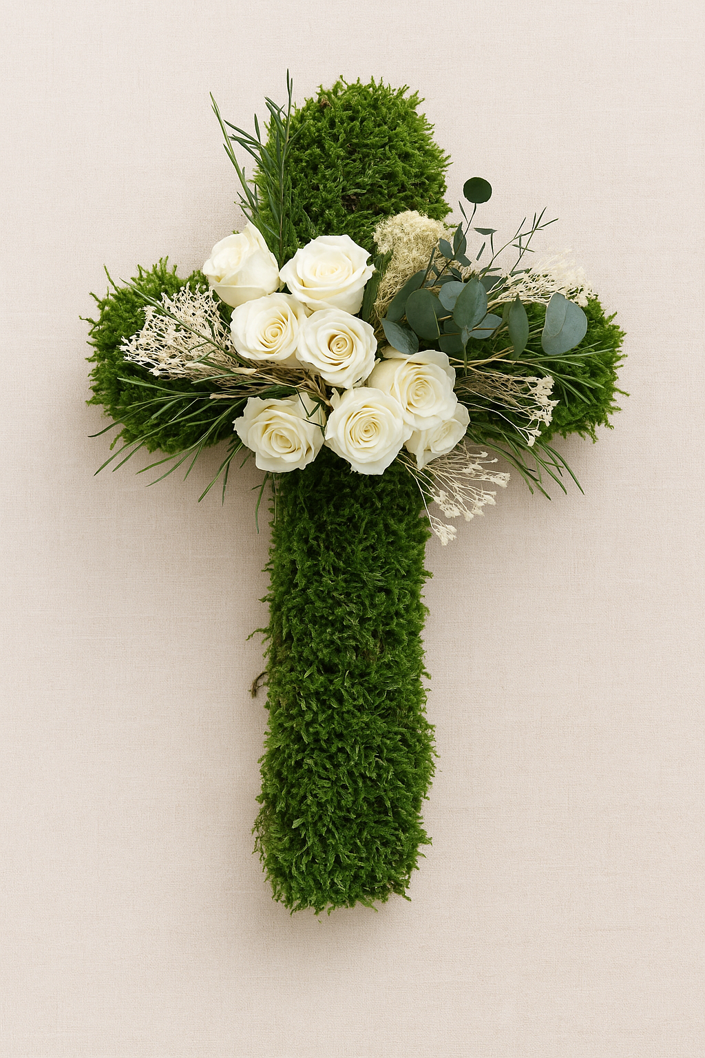 Croix funéraire végétale – Roses blanches et mousse éternelle