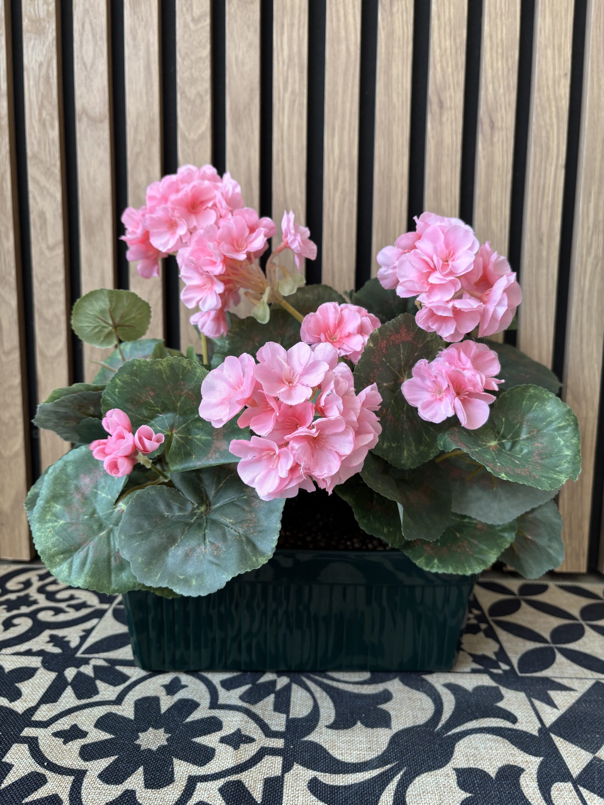 Cette jardinière de géraniums artificiels est une solution de fleurissement durable, sobre et élégante pour une sépulture ou un espace de recueillement. Les fleurs aux tons rose tendre, associées à un feuillage dense et réaliste, apportent une présence douce et lumineuse tout au long de l’année.